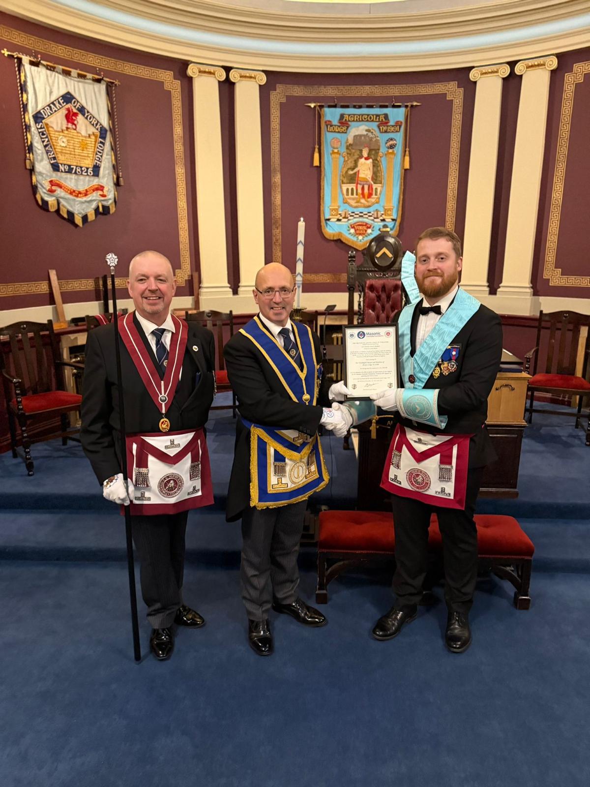 Although Adam first took the Chair in 2020, his year was heavily disrupted by Covid, so this was a well-deserved moment to celebrate. We were also delighted to welcome W. Bro Harry Elliott, Provincial Junior Warden, representing the Provincial Grand Master, and his DC W. Bro Andy Hinchcliff, who presented the Lodge with a Festival Patron certificate. The WM then handed W. Bro Elliott a further cheque for £3,000 in support of Festival 29. The Lodge was also pleased to welcome many visitors visitors including from the Provinces of Yorkshire West Riding and Nottinghamshire. Here’s to a fantastic year in the Chair, Adam!